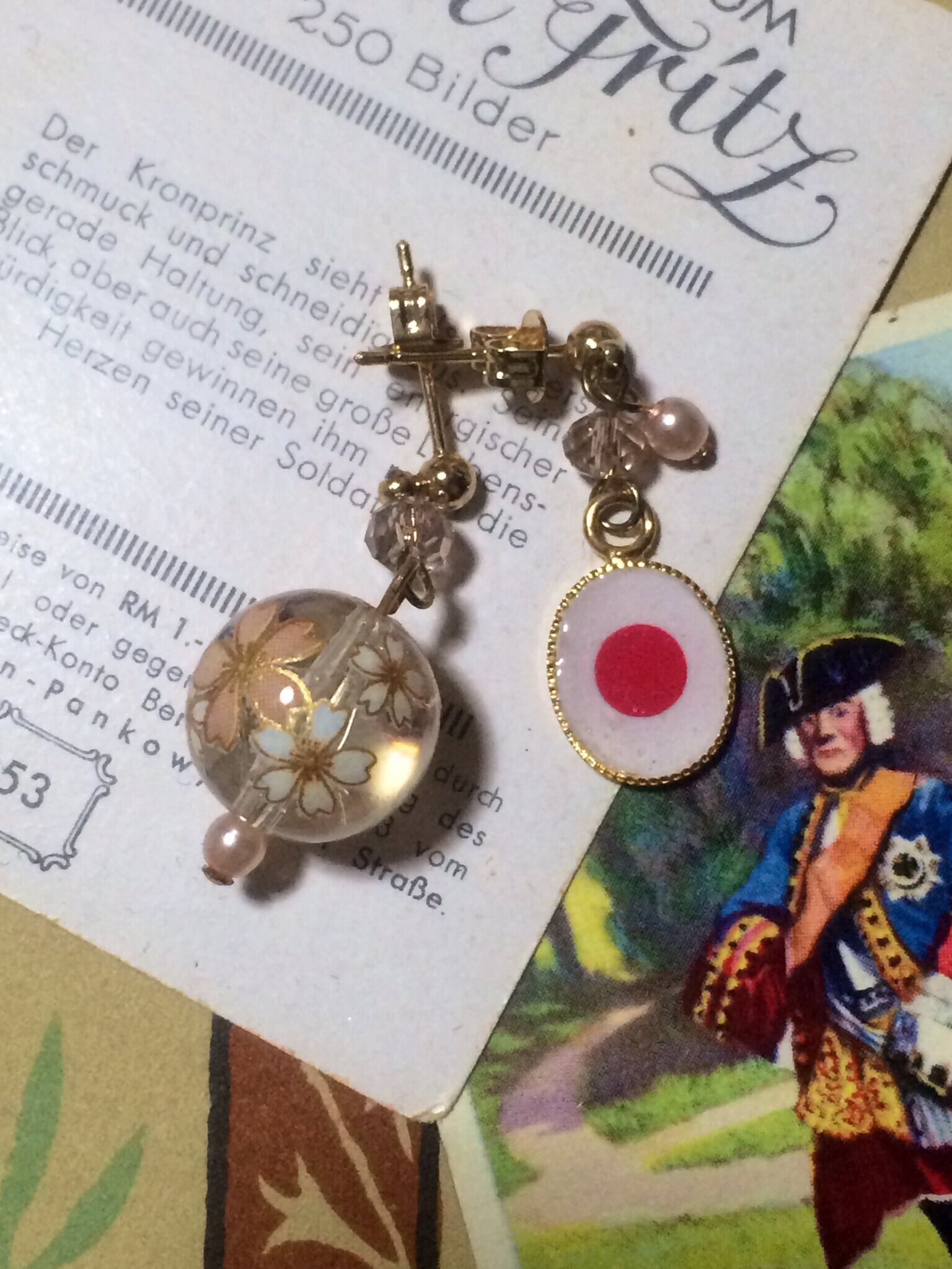 日本の国旗チャームとクリアカラーの桜プリントのビーズのピアスです 。