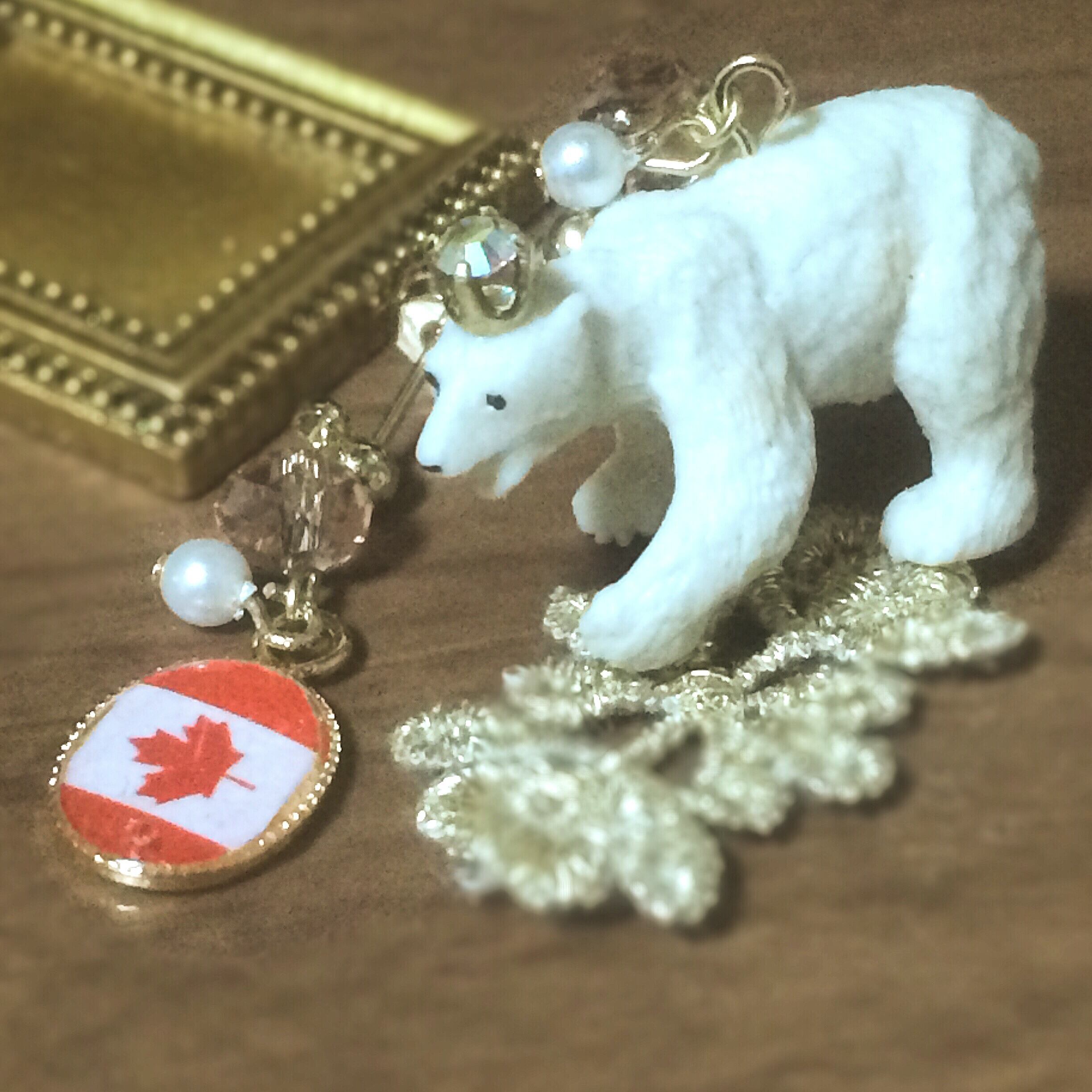 カナダ国旗チャームと小さなシロクマさんのピアスです 。