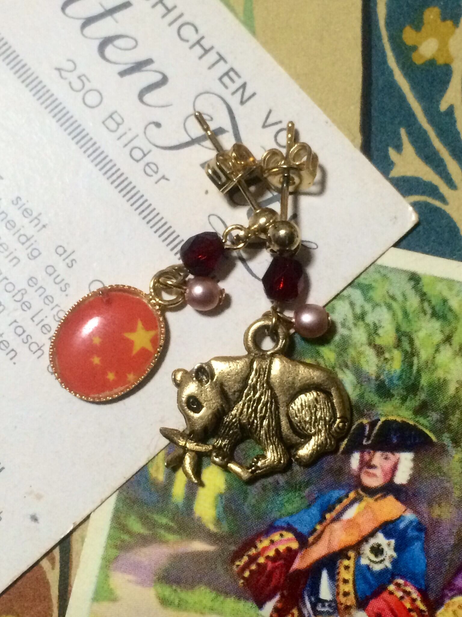 中国の国旗チャームと小さなパンダチャームのピアスです 。