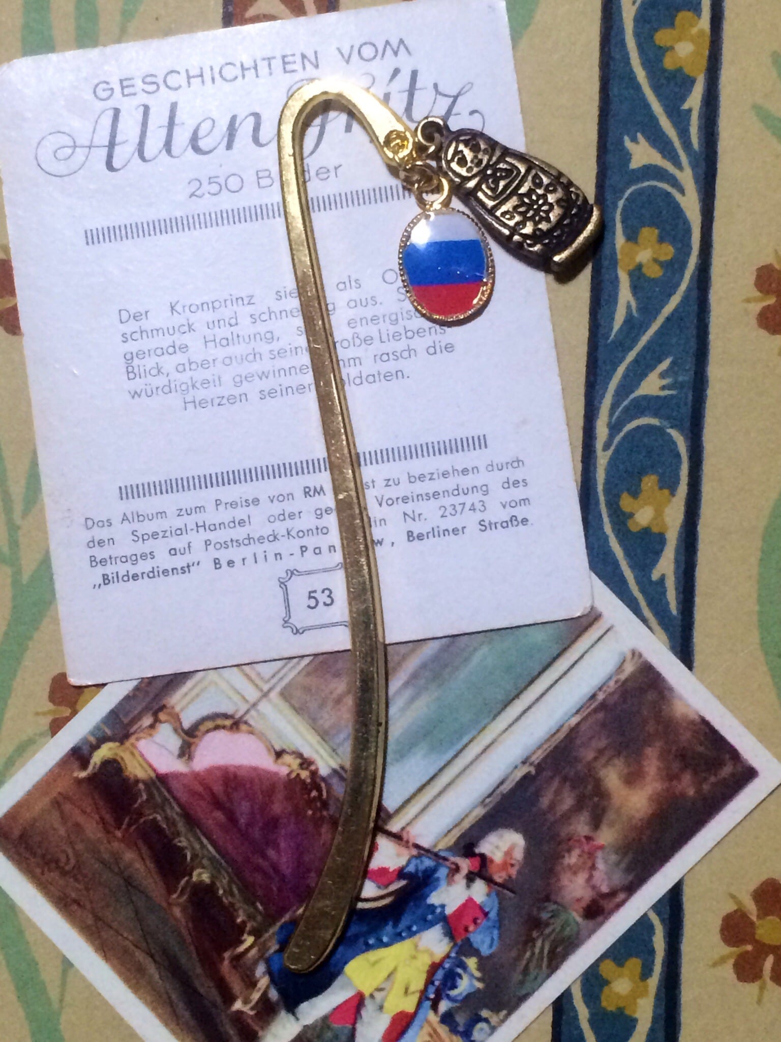 ロシア国旗のチャームと小さなマトリョーシカのチャームがついたブックマーカー(しおり)です。
